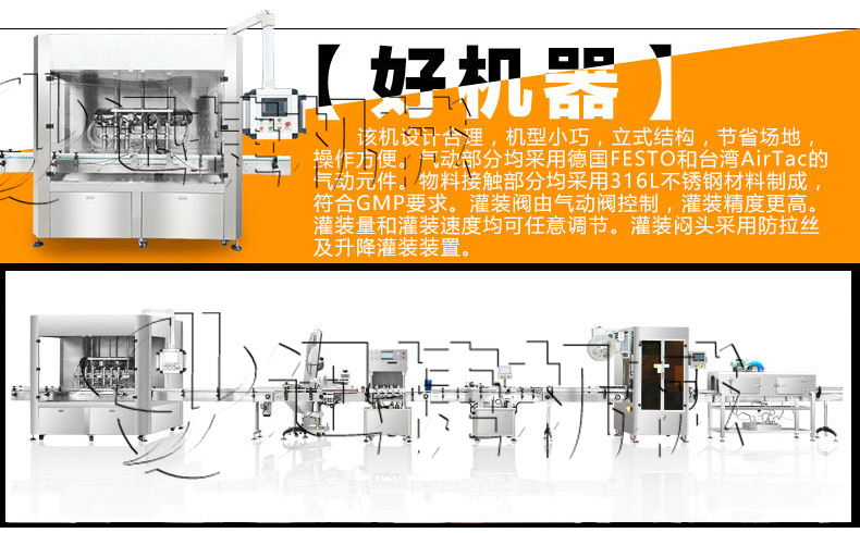 全自動(dòng)辣椒醬六頭灌裝機(jī)作為公司新研發(fā)的灌裝設(shè)備在市場(chǎng)上起到了關(guān)鍵性的作用,是集光,機(jī),電,氣于一體,采用活塞式定量原理,灌裝精度高,操作簡(jiǎn)單,維護(hù)方便,設(shè)備主要材質(zhì):采用SUS304不銹鋼制造,符合衛(wèi)生要求.灌裝過(guò)程采用亞克力透明板與外界隔離,保證灌裝的衛(wèi)生要求。灌裝采用壓力式灌裝,無(wú)需配裝高位罐,簡(jiǎn)化了安裝工序,提高了灌裝效率。可廣泛應(yīng)用于食品、醬料行業(yè)產(chǎn)品的自動(dòng)化包裝生產(chǎn)。