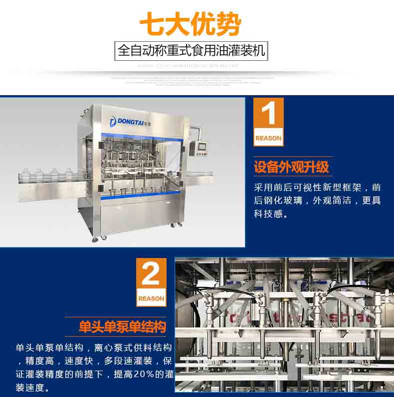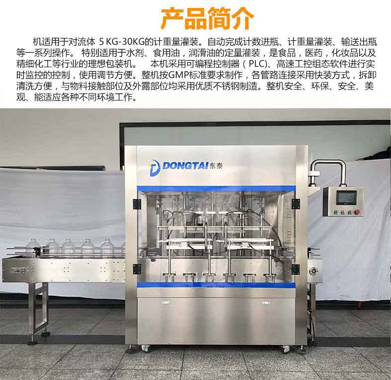 本機(jī)適用于對流體5kg-30kg的計(jì)重量灌裝。自動完成計(jì)數(shù)進(jìn)瓶、計(jì)重量灌裝、輸送出瓶等一系列操作。 特別適用于水劑、食用油,潤滑油的定量灌裝,是食品,醫(yī)藥,化妝品以及精細(xì)化工等行業(yè)的包裝機(jī)。本機(jī)采用可編程控制器(PLC)、高速工控組態(tài)軟件進(jìn)行實(shí)時(shí)監(jiān)控的控制,使用調(diào)節(jié)方便。整機(jī)按GMP標(biāo)準(zhǔn)要求制作,各管路連接采用快裝方式,拆卸清洗方便,與物料接觸部位及外露部位均采用優(yōu)質(zhì)不銹鋼制造。整機(jī)安全、環(huán)保、安全、美觀、能適應(yīng)各種不同環(huán)境工作。