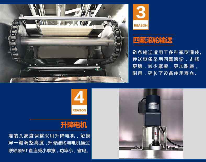 2、鏈條輸送適用于多種瓶型灌裝。傳送鏈條采用四氟滾輪,走瓶更穩(wěn),較少摩擦,更加耐磨,耐用,延長了設(shè)備使用壽命。增加卡瓶口裝置:方便瓶口小的容器灌裝,灌裝頭和瓶口的定位更準(zhǔn)確;采用O型擋板,屏蔽漲緊輪的弊端(采用魚眼調(diào)節(jié)鏈輪的松緊度),輸送采用四氟滾輪式,容器輸送更平穩(wěn),可正反轉(zhuǎn)輸送;