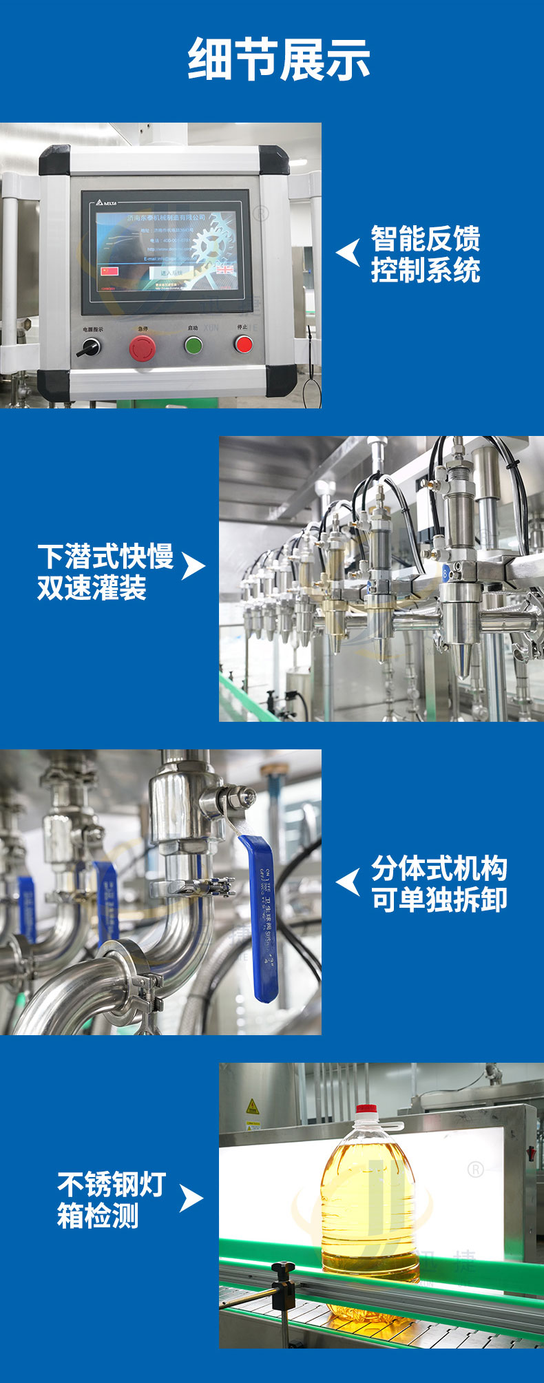 全自動八頭食用油灌裝機單頭單泵單變頻控制,容積和質量兩種計量方式自由轉換,灌裝調節(jié)方便快捷。
