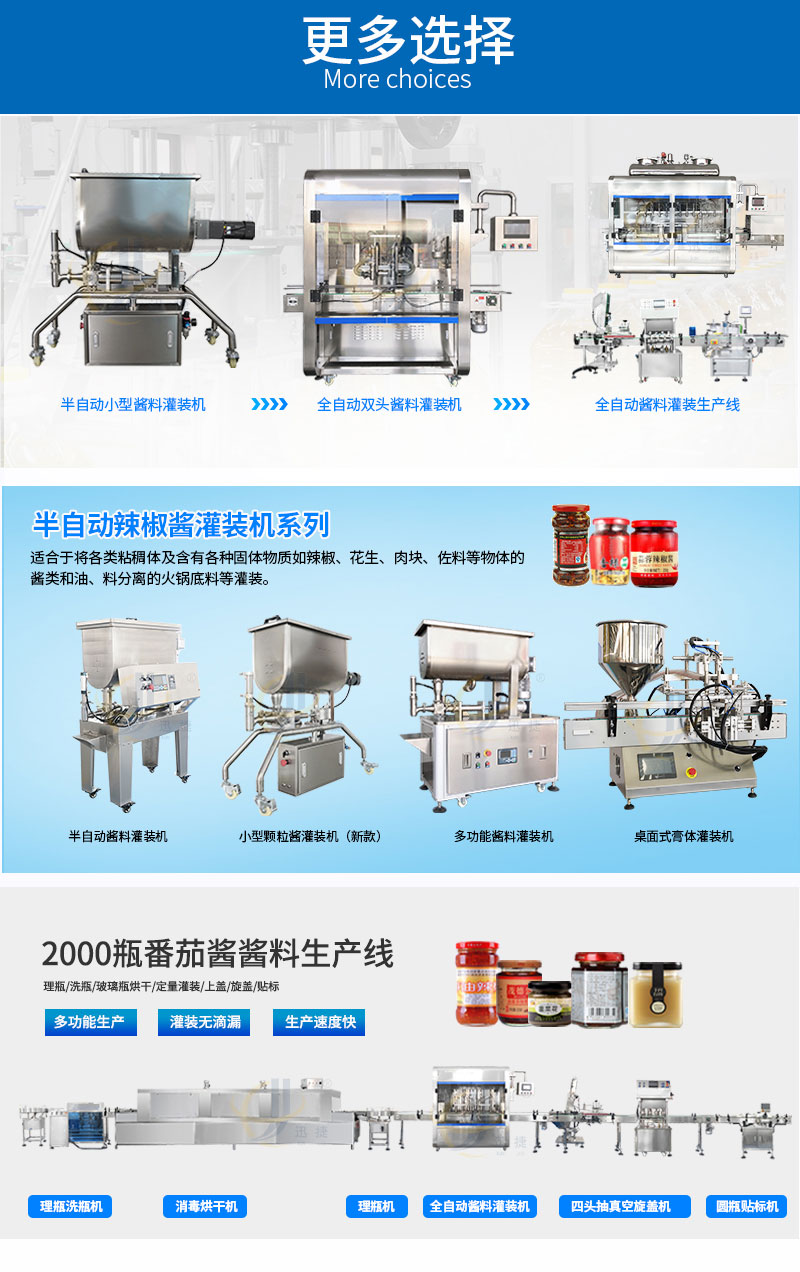全自動四頭辣椒醬灌裝機(jī)適合中小口徑三旋、四旋玻璃瓶調(diào)味醬的分裝,適合醬料、含顆粒黏稠物料的灌裝,物料接觸部分均采用