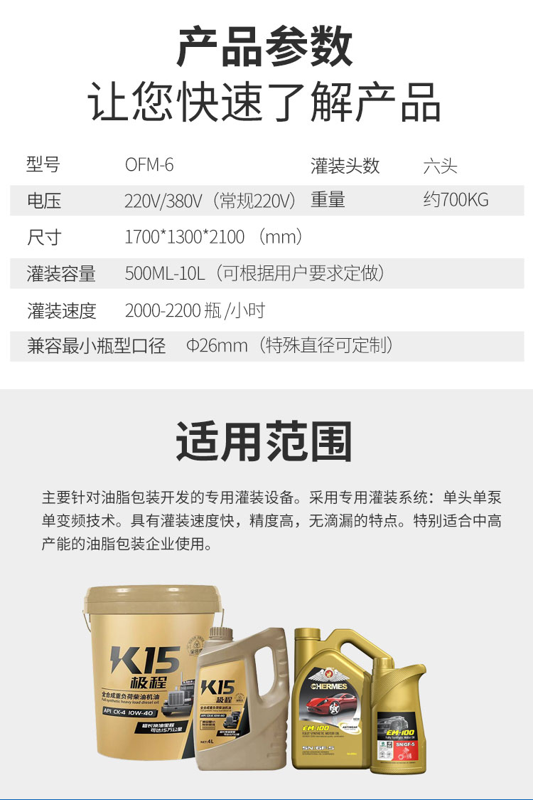全自動(dòng)六頭稱重潤滑油灌裝機(jī)主要針對(duì)油脂包裝開發(fā)的專用灌裝設(shè)備。采用專用灌裝系統(tǒng):單頭單泵單變頻技術(shù)。具有灌裝速度快