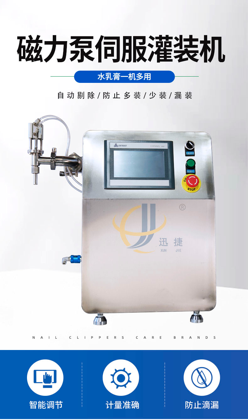 1.本機(jī)采用伺服電機(jī)驅(qū)動(dòng),PLC和觸摸屏控制,316L材質(zhì)齒輪泵灌裝原理,適合日化、醫(yī)藥、食品、油脂等各類(lèi)流體和半流體物料定量灌裝。2.灌裝量通過(guò)觸摸屏調(diào)節(jié),灌裝量調(diào)節(jié)無(wú)上限,泵頭易拆裝易清洗,非常適合產(chǎn)品種類(lèi)多,需要經(jīng)常調(diào)節(jié)范圍的用戶(hù)。3.計(jì)量準(zhǔn)確,灌裝100ML,可以實(shí)現(xiàn)不大于0.5ML的誤差。